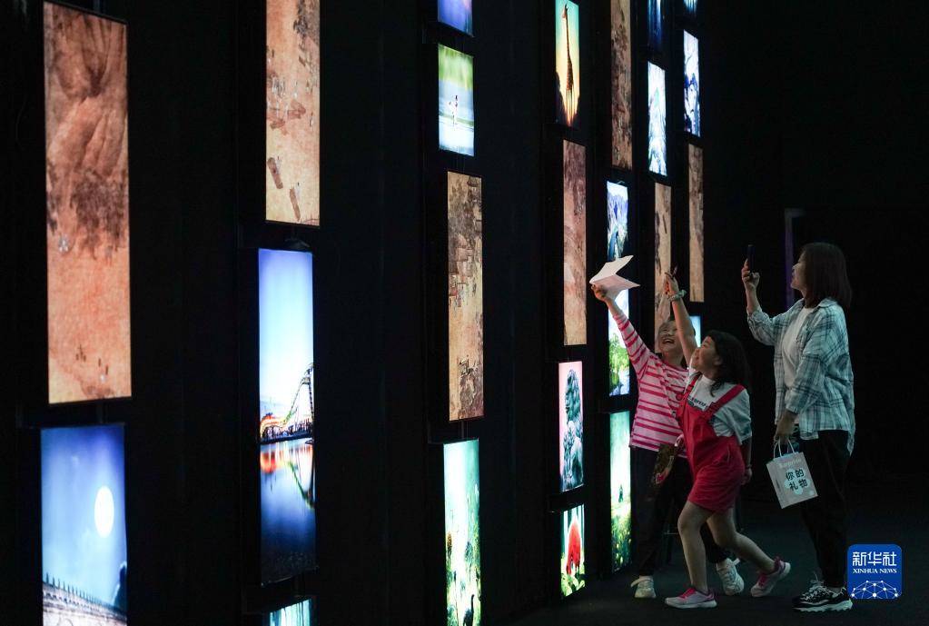 在位于北京的瞭倉數字藏品博物館,觀眾在一間以永定河生態為主題、展示動態畫作、實景照片和人工智能生成畫作的展廳里參觀(5月14日攝)。