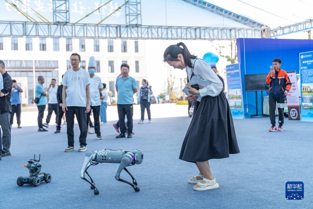 5月17日,在重慶市永川區舉行的2023年成渝地區雙城經濟圈職業教育活動周辦學成果展上,重慶科創職業學院與企業聯合研發的機器狗在現場與觀眾互動。