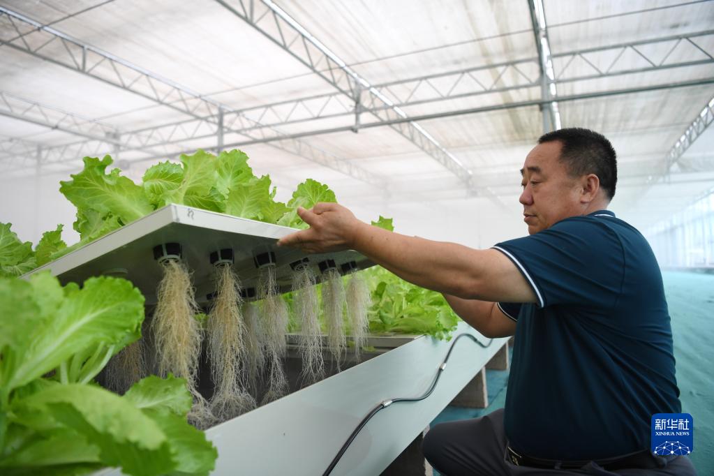 5月17日,饒陽縣一處高品質(zhì)蔬菜產(chǎn)業(yè)園的工作人員在設(shè)施溫室查看水培蔬菜生長情況。