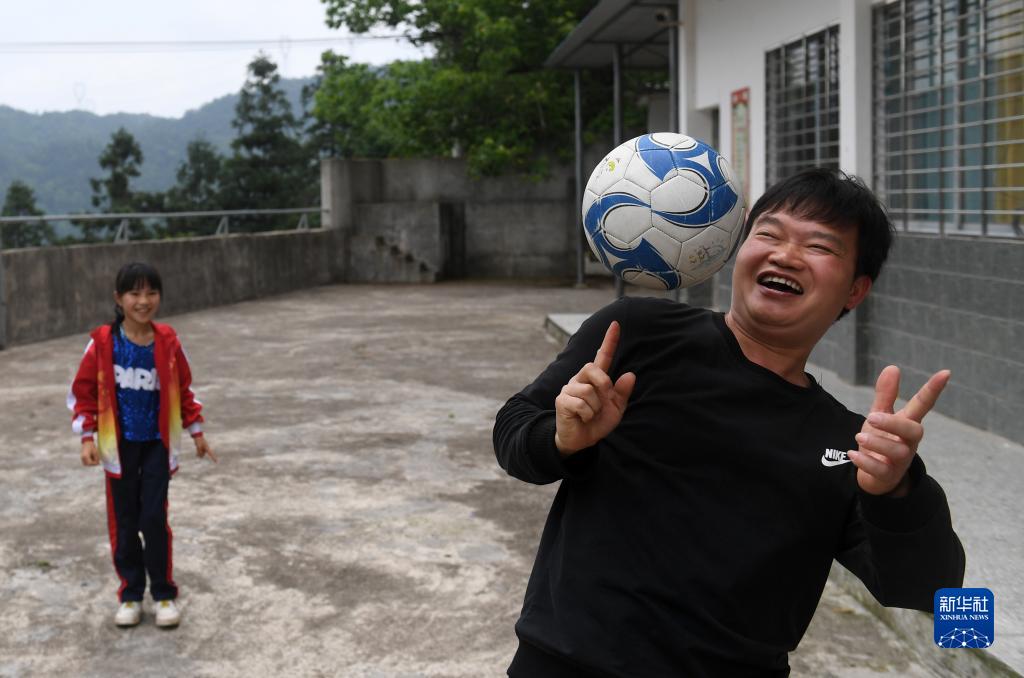 5月17日,在廣西靈川縣海洋鄉(xiāng)中心岐教學點,蔡教宏和學生在課間做游戲。