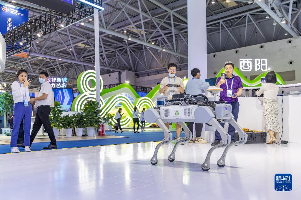 5月18日,工作人員在“西洽會”上給觀眾展示應用于地下電纜隧道巡檢的機器狗。