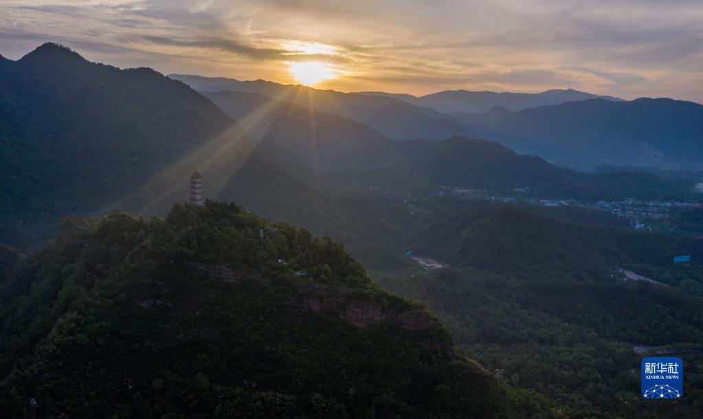 5月16日,在浙江天臺縣,清晨的陽光照在赤城山頂的梁妃塔上(無人機照片)。