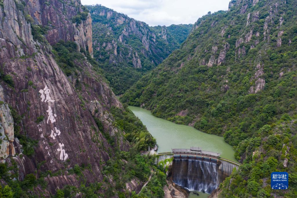 天臺山瓊臺仙谷景區(5月16日攝,無人機照片)。徐霞客在游記中寫道:“峰頭中斷,即為雙闕;雙闕所夾而環者,即為瓊臺。”
