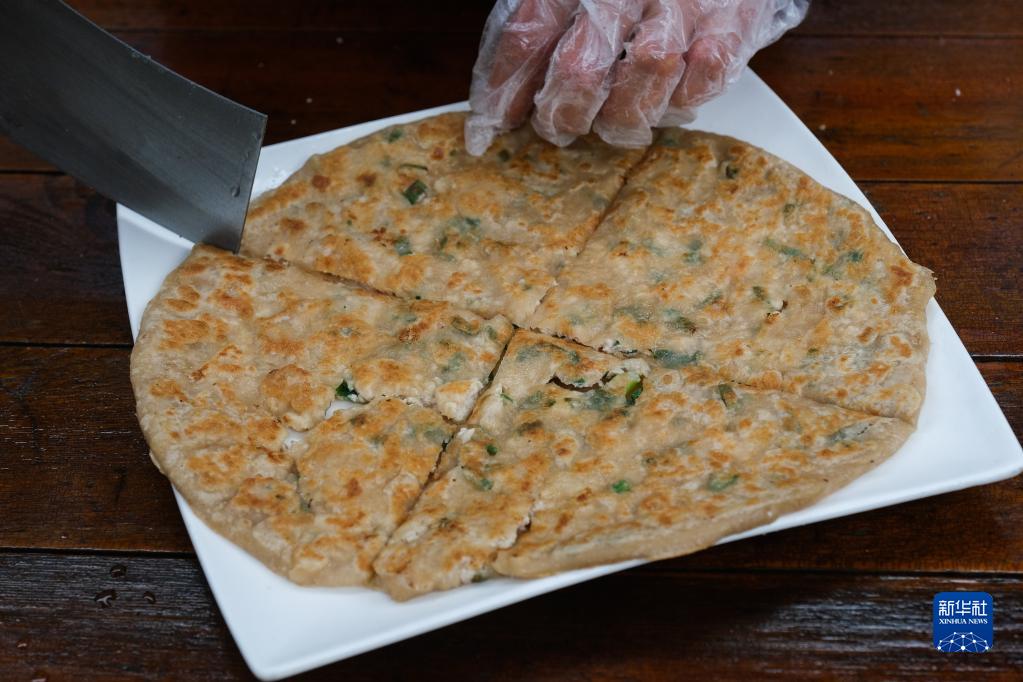 在天臺山游客中心拍攝的當地特色美食“麥餅”(5月17日攝)。