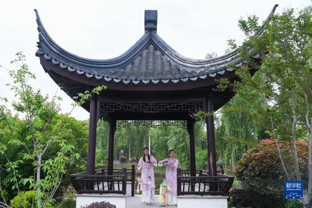 孫菁(右)和施錦芳在蘇州市吳江區(qū)七都鎮(zhèn)一處公園內(nèi)排練(4月18日攝)。