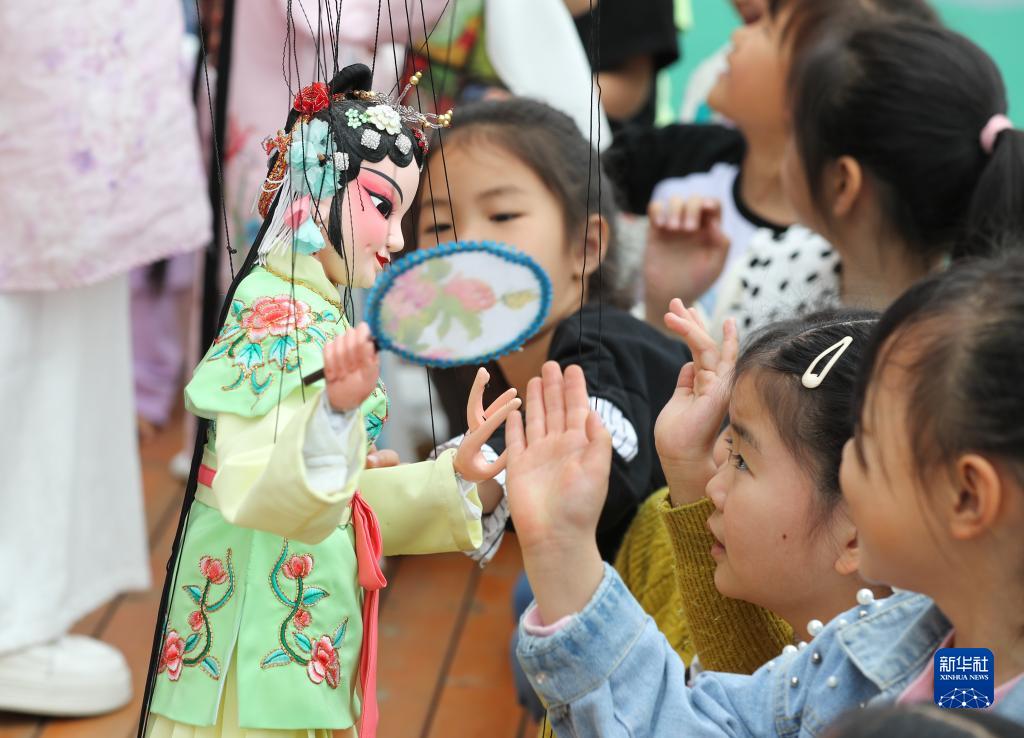 在七都幼兒園,小朋友與提線木偶互動(4月20日攝)。