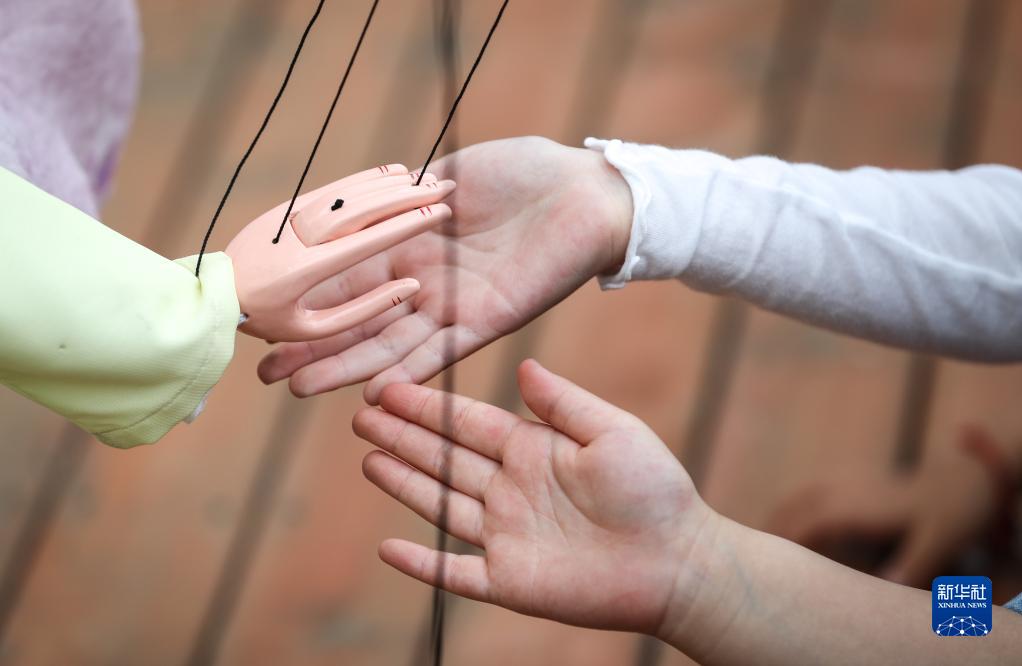 在七都幼兒園,小朋友與提線木偶互動(4月20日攝)。