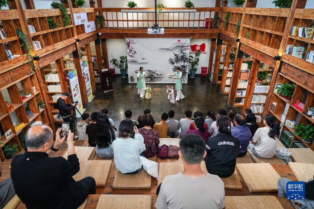 5月17日,孫菁(左)、施錦芳在七都鎮(zhèn)江村文化禮堂表演昆曲木偶《牡丹亭·游園》。