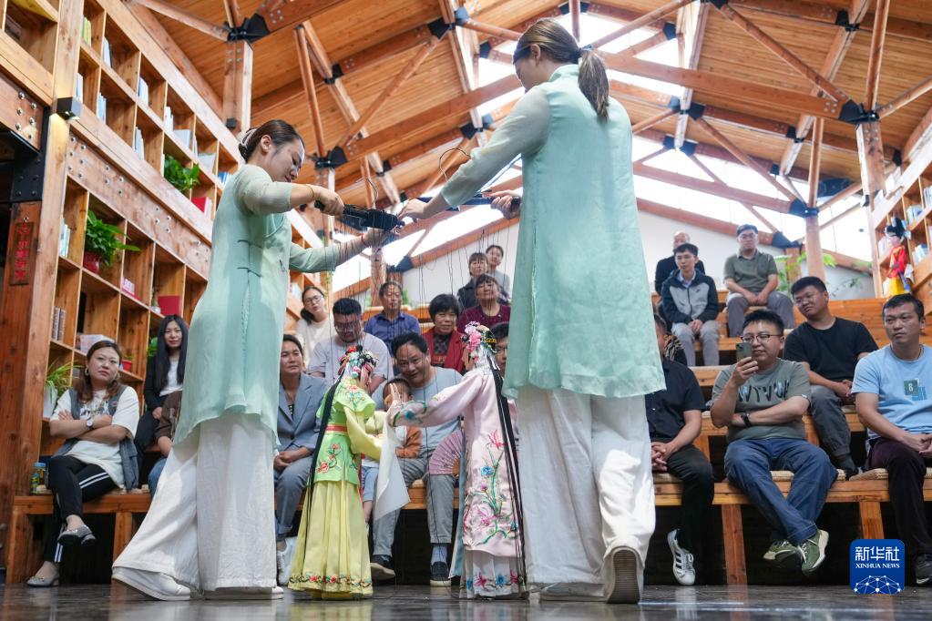 孫菁(前左)和施錦芳在七都鎮(zhèn)江村文化禮堂表演昆曲木偶(5月17日攝)。