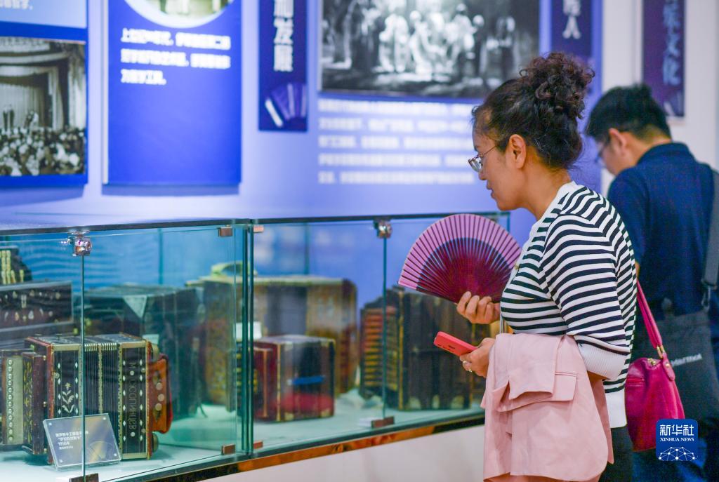 5月18日,在位于伊寧市六星街的亞歷山大手風琴珍藏館,游客在參觀展出的手風琴。