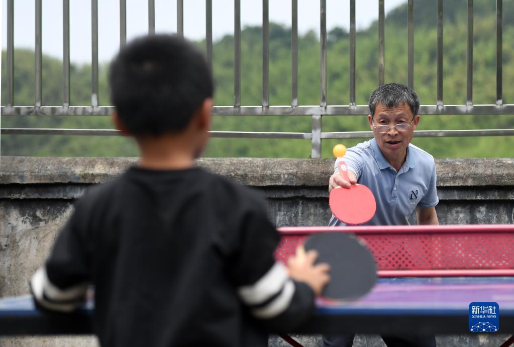 5月18日,在廣西靈川縣蘭田瑤族鄉深潭教學點,趙洪老師和學生打乒乓球。
