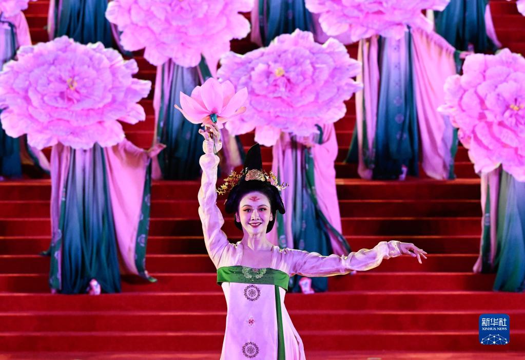 5月18日晚,出席中國-中亞峰會的中亞國家元首夫婦陸續抵達陜西省西安市大唐芙蓉園,參加在這里舉行的歡迎儀式。這是演員在歡迎儀式上表演。新華社記者 申宏 攝