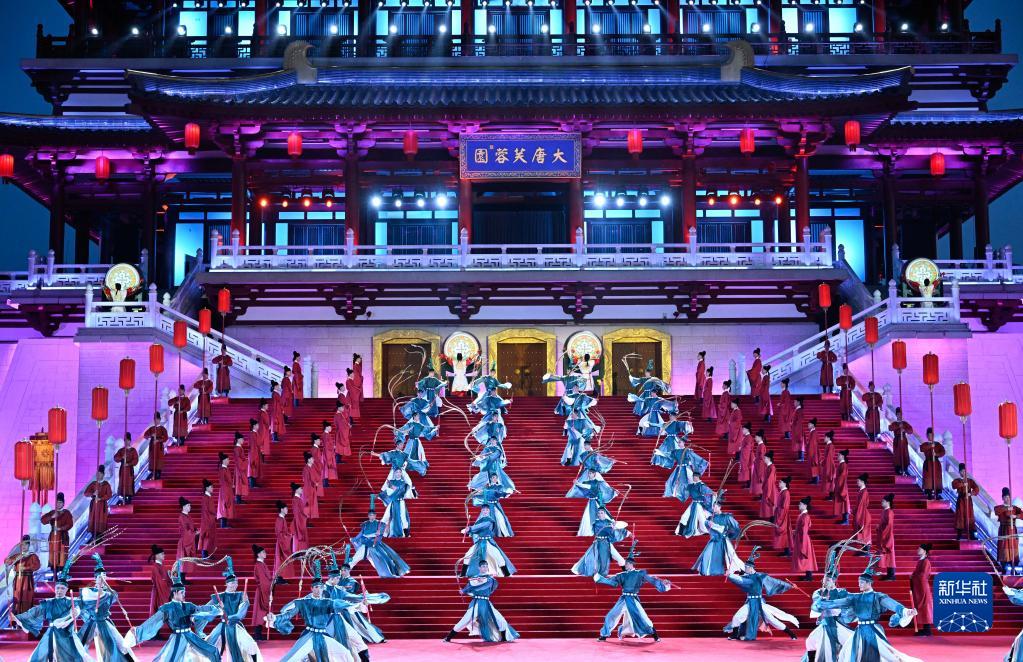 5月18日晚,出席中國(guó)-中亞峰會(huì)的中亞國(guó)家元首夫婦陸續(xù)抵達(dá)陜西省西安市大唐芙蓉園,參加在這里舉行的歡迎儀式。這是演員在歡迎儀式上表演。新華社記者 申宏 攝