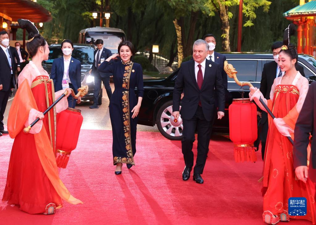 5月18日晚,出席中國-中亞峰會的中亞國家元首夫婦陸續(xù)抵達陜西省西安市大唐芙蓉園,參加在這里舉行的歡迎儀式。這是烏茲別克斯坦總統(tǒng)米爾濟約耶夫和夫人米爾濟約耶娃抵達。新華社記者 徐子鑒 攝