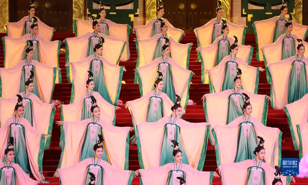 5月18日晚,出席中國-中亞峰會的中亞國家元首夫婦陸續抵達陜西省西安市大唐芙蓉園,參加在這里舉行的歡迎儀式。這是演員在歡迎儀式上表演。新華社記者 丁海濤 攝