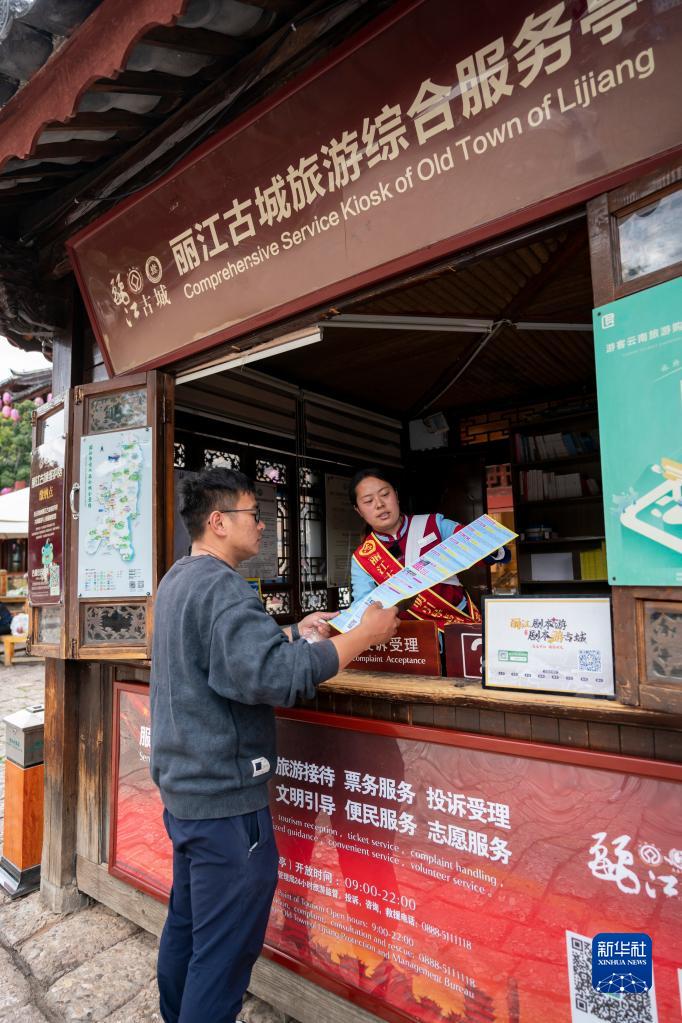 5月18日,一名志愿者(右)在麗江古城一處旅游綜合服務亭為游客提供旅游咨詢。