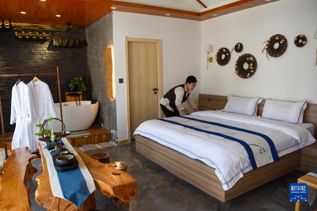 新疆伊犁哈薩克自治州霍城縣大西溝鄉(xiāng)桃花村一家民宿的老板在整理客房(5月17日攝)。