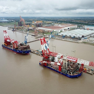 5月19日在江蘇省南通市啟東海工船舶工業園拍攝的上海振華重工啟東海洋工程股份有限公司,和該公司建設中的4000噸全回轉起重船(左)和1800噸風電安裝平臺(無人機照片)。