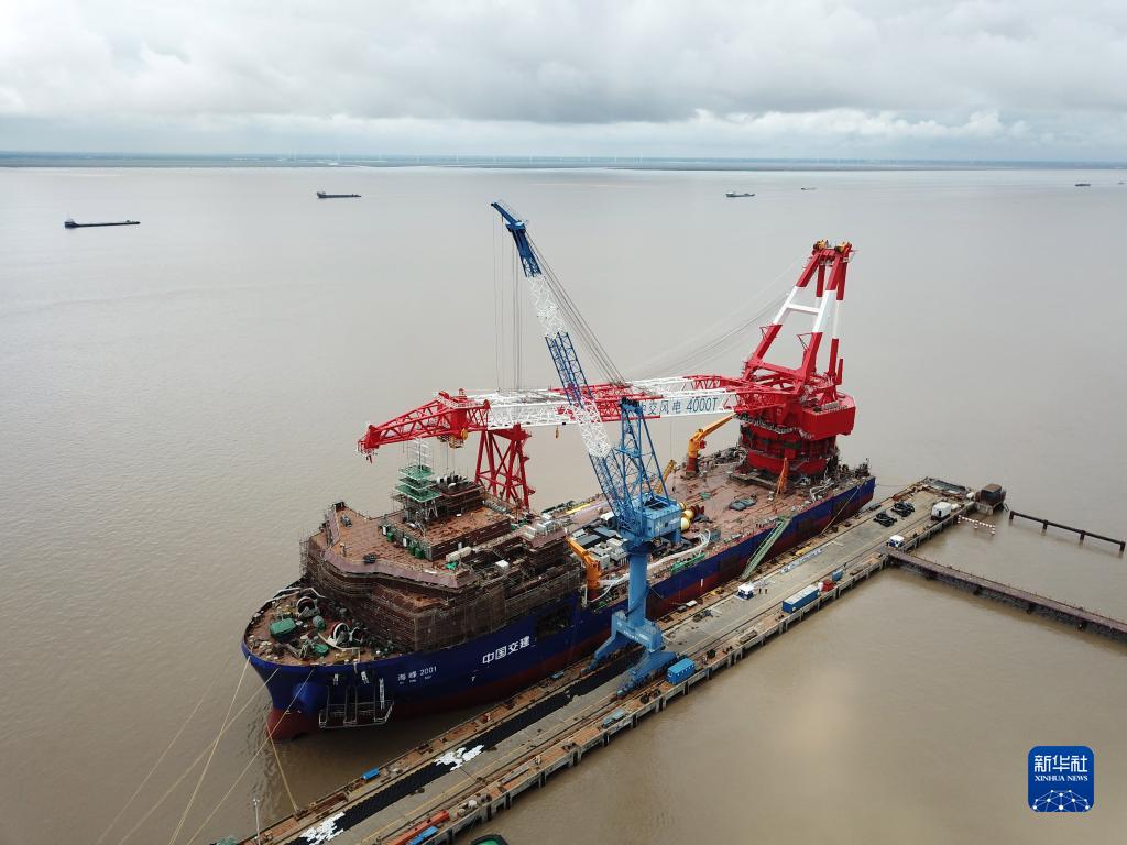 5月19日在江蘇省南通市啟東海工船舶工業(yè)園拍攝的,上海振華重工啟東海洋工程股份有限公司正在建設(shè)中的4000噸全回轉(zhuǎn)起重船(右)(無人機照片)。