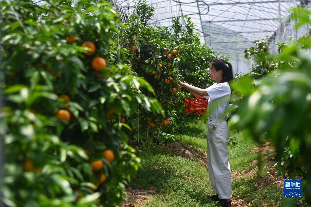 5月19日,游客在建德柑橘科技小院基地大棚內采摘柑橘。