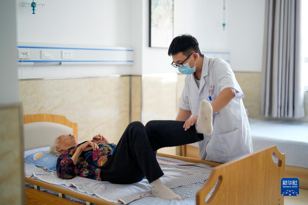 5月19日,河北省灤南縣一家養老機構的工作人員在指導老人進行康復訓練。