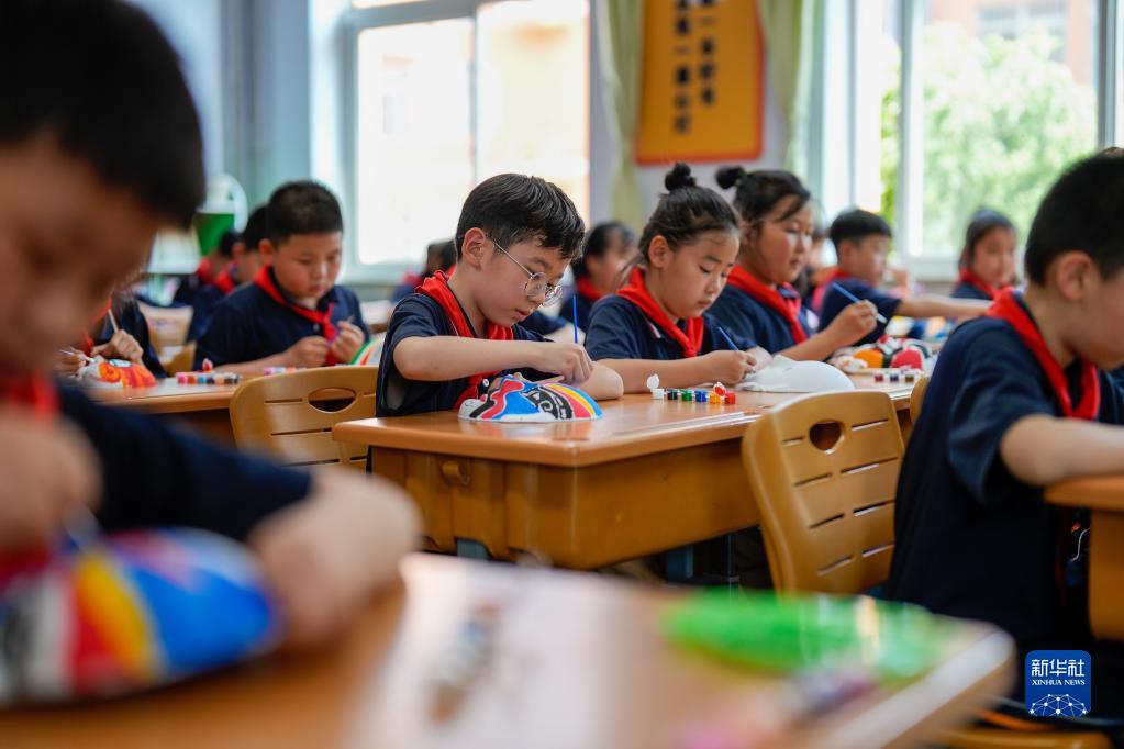 5月19日,河北省灤南縣第一實驗小學手工社團的學生在給京劇臉譜上色。