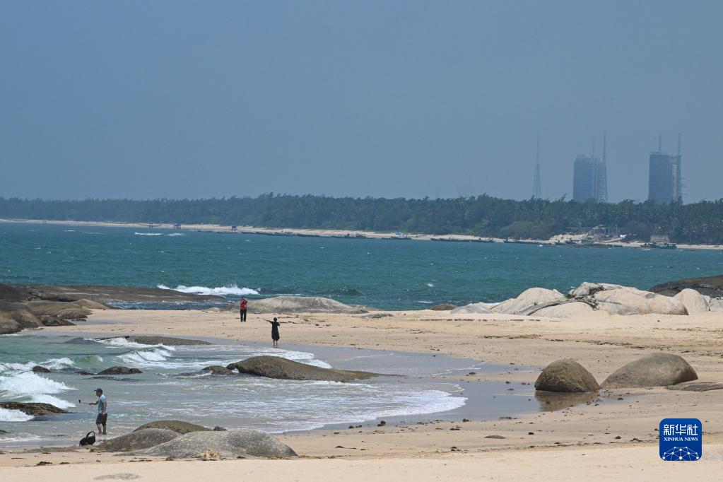 5月17日,游客在海南省文昌市淇水灣游玩,這里可以望見文昌航天發射場的發射塔架。