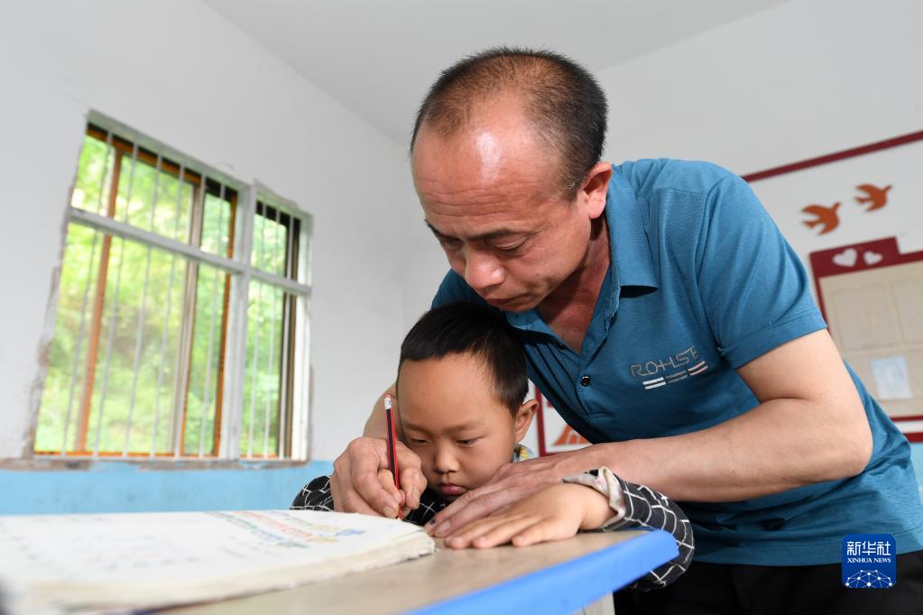 5月19日,在廣西靈川縣大境瑤族鄉金竹教學點,李忠華教一名學生寫字。