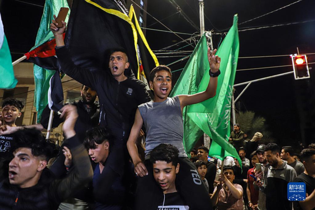 5月13日,巴勒斯坦人在加沙城街頭慶祝?;饏f議達成。