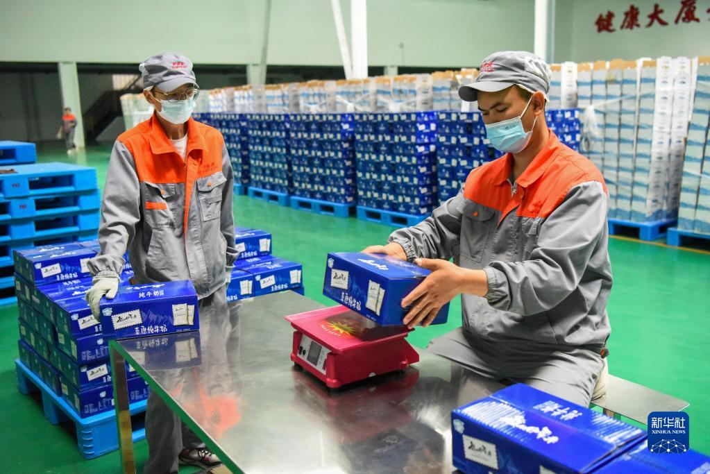 在位于新疆伊寧市的伊犁伊牧欣乳業(yè)有限公司,工人在包裝車間忙碌(5月19日攝)。