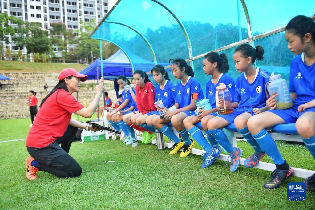 在海南瓊中縣舉辦的中國足協女足青訓中心“希望杯”U12組四川隊對陣廣東隊比賽的中場休息時間,來自涼山彝族自治州的四川隊隊員舍布么扯鳩莫(右三)與隊友們在聽主教練陳華布置戰術(4月10日攝)。