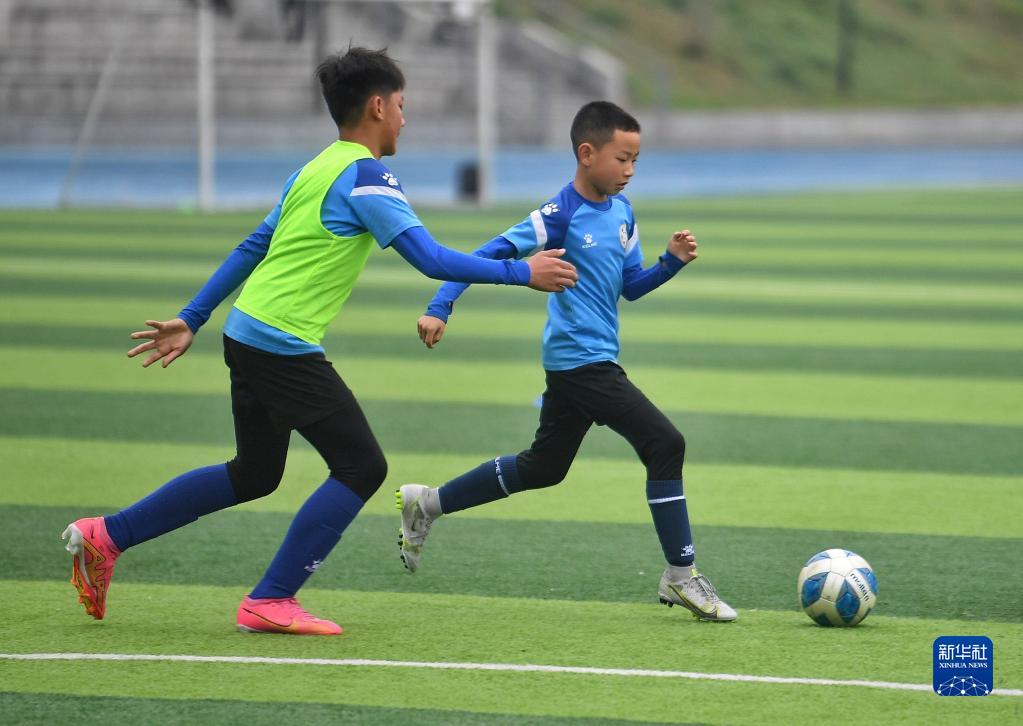 在瀘州天立春雨學校足球場,來自涼山彝族自治州的金貴坤(右)與隊友進行訓練(3月28日攝)。
