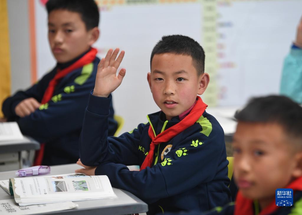 在瀘州天立春雨學校教室,來自涼山彝族自治州的金貴坤(中)在課堂上舉手回答老師提問(3月28日攝)。