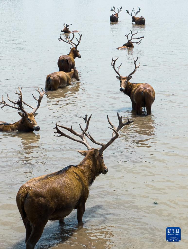 5月19日,一群麋鹿在湖北石首麋鹿國家級自然保護區內活動(無人機照片)。