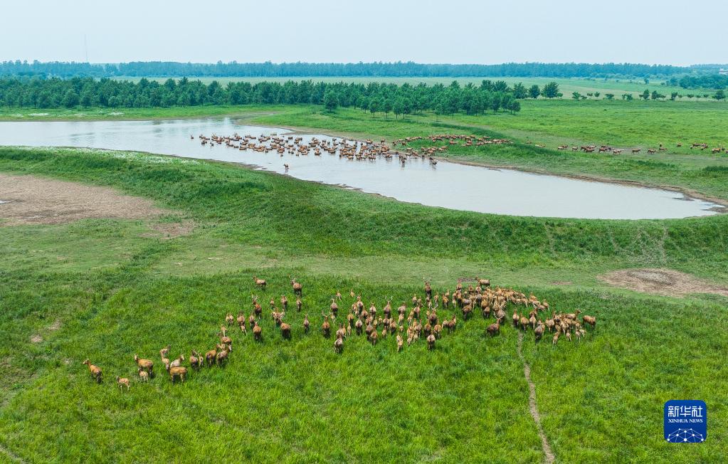 5月19日,一群麋鹿在湖北石首麋鹿國家級自然保護區內活動(無人機照片)。