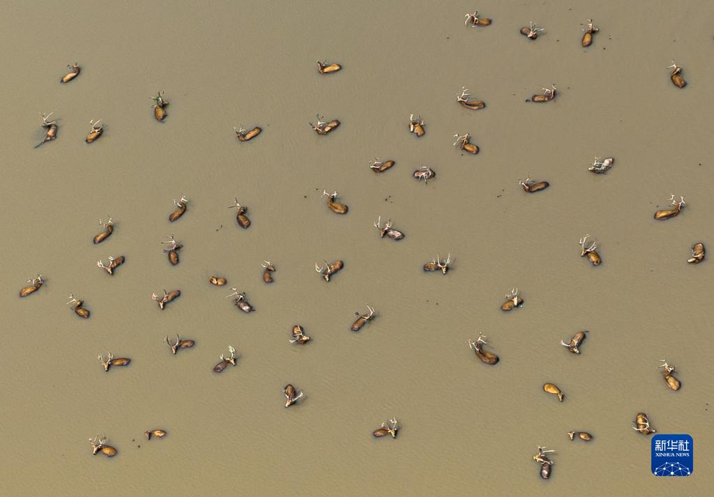 5月19日,一群麋鹿在湖北石首麋鹿國家級自然保護區內活動(無人機照片)。