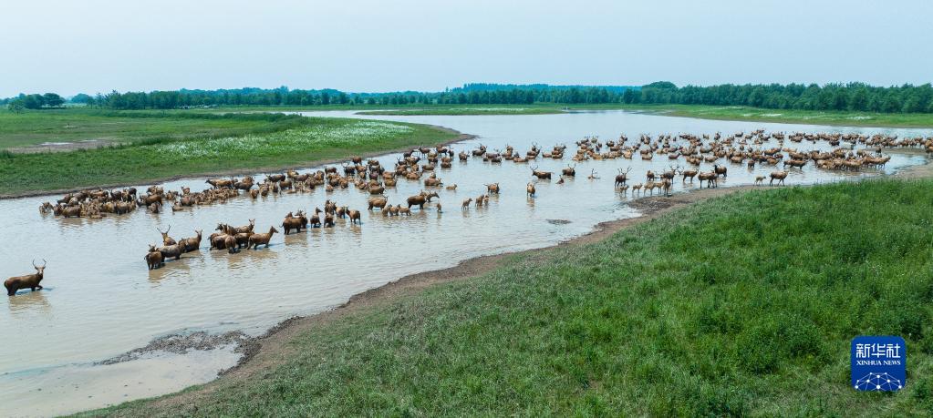 5月19日,一群麋鹿在湖北石首麋鹿國家級自然保護區內活動(無人機照片)。