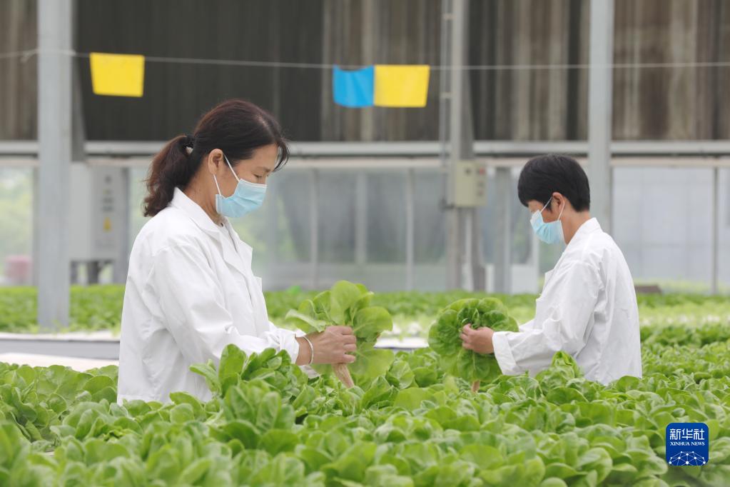 5月20日,河北省保定市徐水區一家現代農業示范園區的工作人員在智能溫室內采收水培蔬菜。