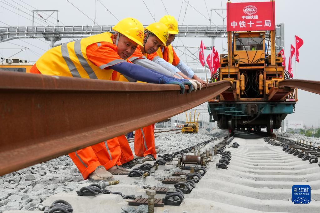 5月20日,在滬寧沿江高鐵太倉站施工現場,中鐵十二局的工程人員利用機械將鋼軌放入承軌槽。