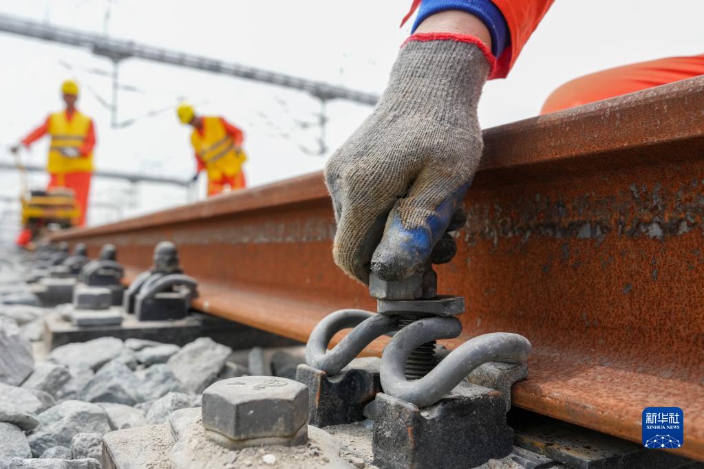 5月20日,在滬寧沿江高鐵太倉站施工現場,中鐵十二局的工程人員準備進行螺栓緊固作業,將對接好的鋼軌固定。