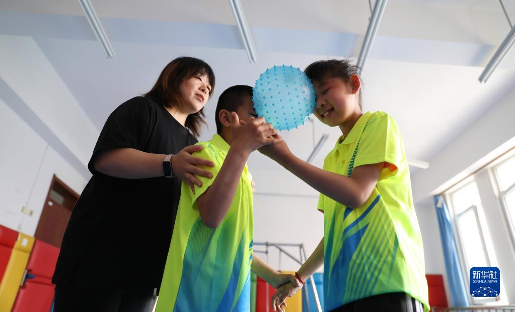 5月19日,莊巖帶著學生在感統教室內進行感覺統合訓練。