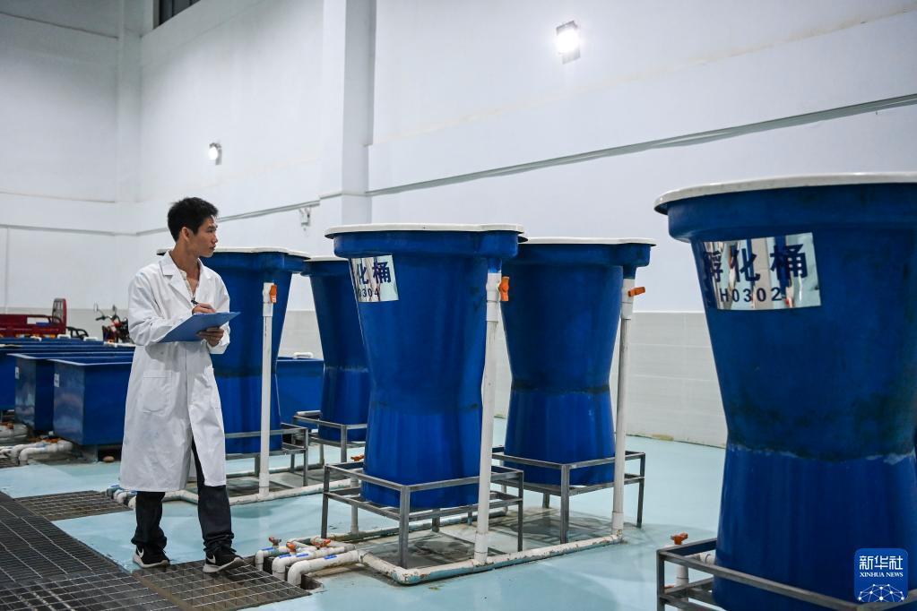 5月20日,技術(shù)人員在廣西大藤峽水利樞紐工程魚類增殖放流站查看魚苗孵化桶。