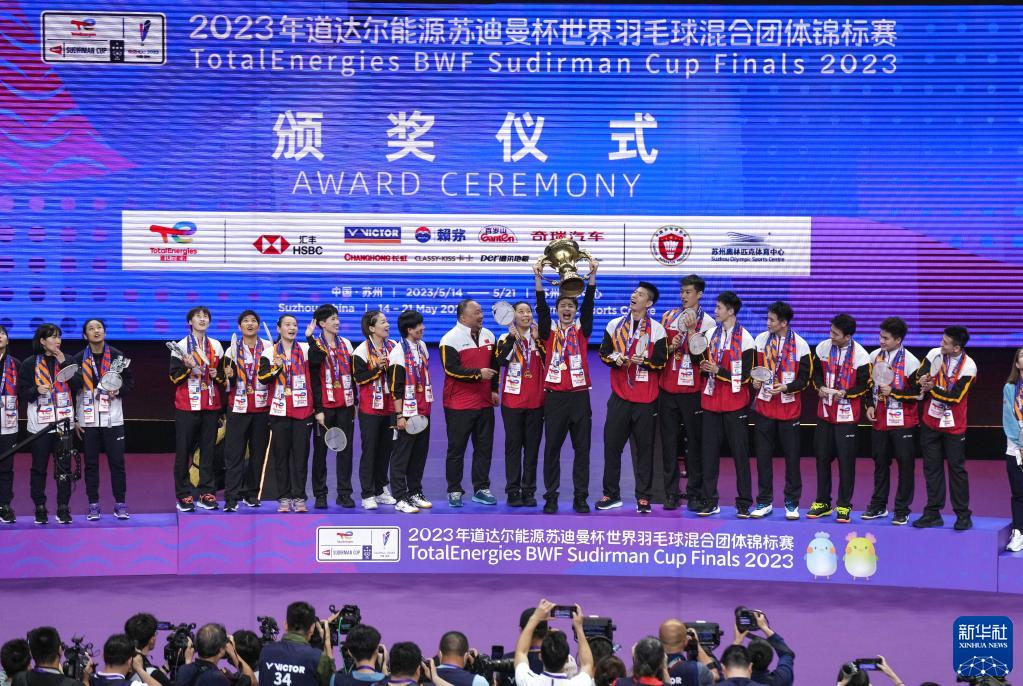 當日,2023年蘇迪曼杯世界羽毛球混合團體錦標賽頒獎儀式在江蘇省蘇州市舉行。中國隊在決賽中以3比0戰勝韓國隊,奪得冠軍。