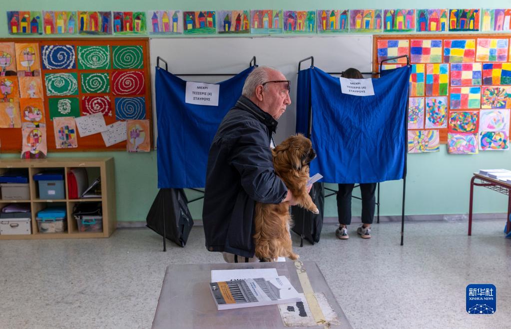 5月21日,一名選民抱著寵物犬在希臘雅典一處投票站參加投票。