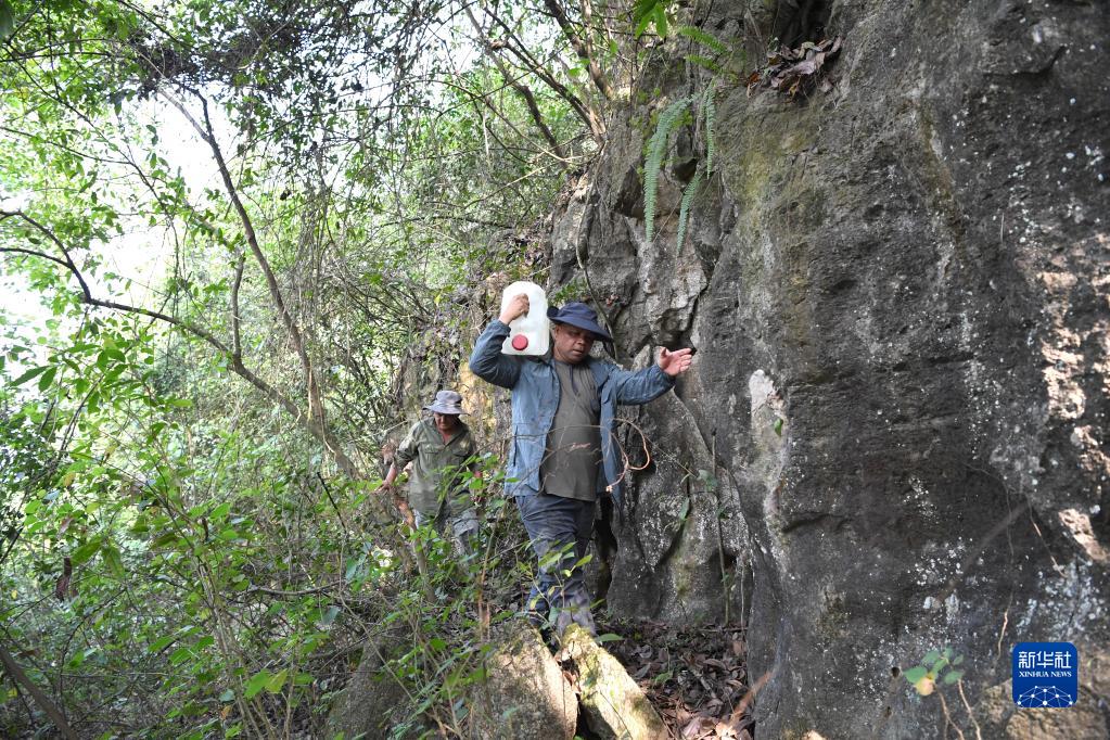 蒙育寧(前)和同事在岜盆自然保護(hù)區(qū)給白頭葉猴送水(5月18日攝)。