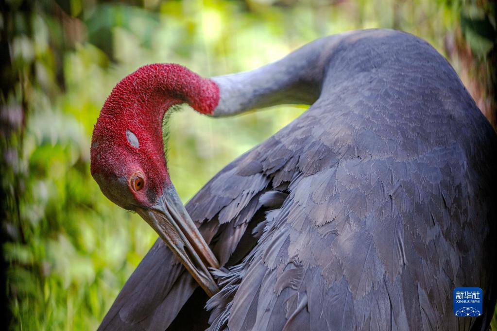 這是5月16日在泰國呵叻府動物園赤頸鶴保育中心拍攝的赤頸鶴。