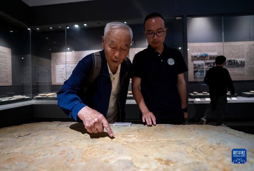 張世山在昆明晉寧博物館內(nèi)講述一塊遺跡化石的發(fā)現(xiàn)經(jīng)過(5月10日攝)。