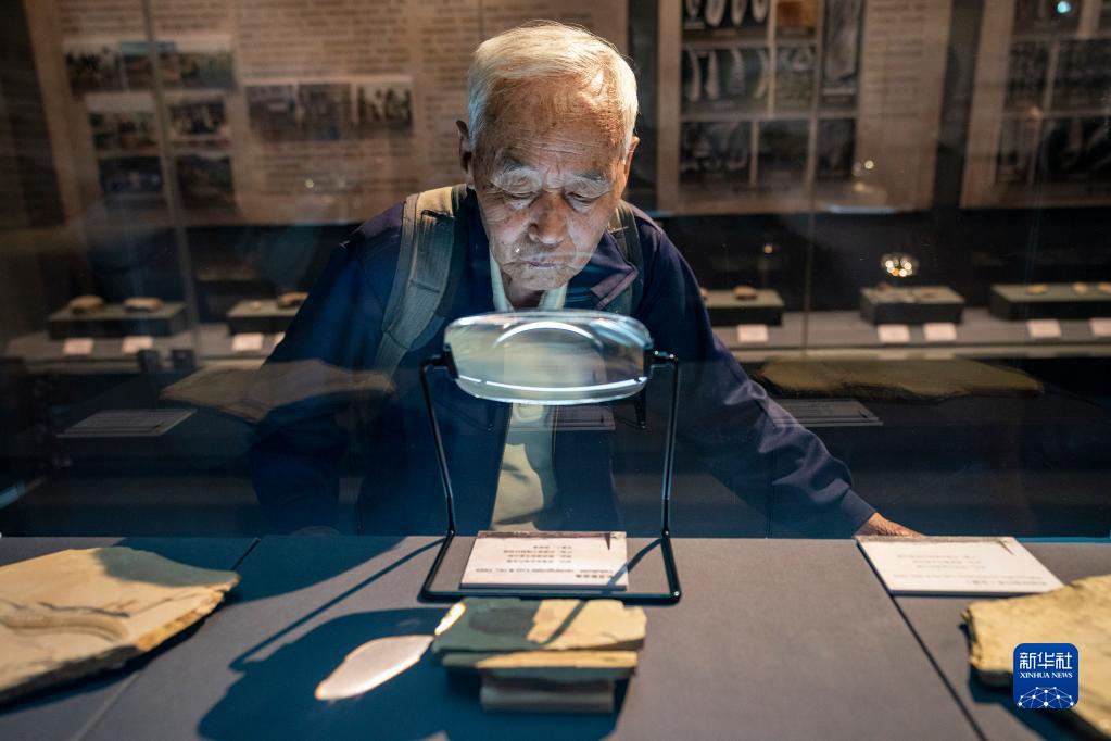 張世山在昆明晉寧博物館內查看一塊由他提供的古生物化石(5月10日攝)。