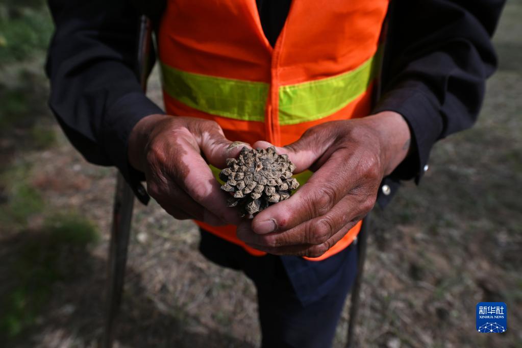 護林員馬裕拿著從林間撿來的松塔,這里很多松樹都是馬裕剛參加工作時種下的,如今已枝繁葉茂(5月17日攝)。