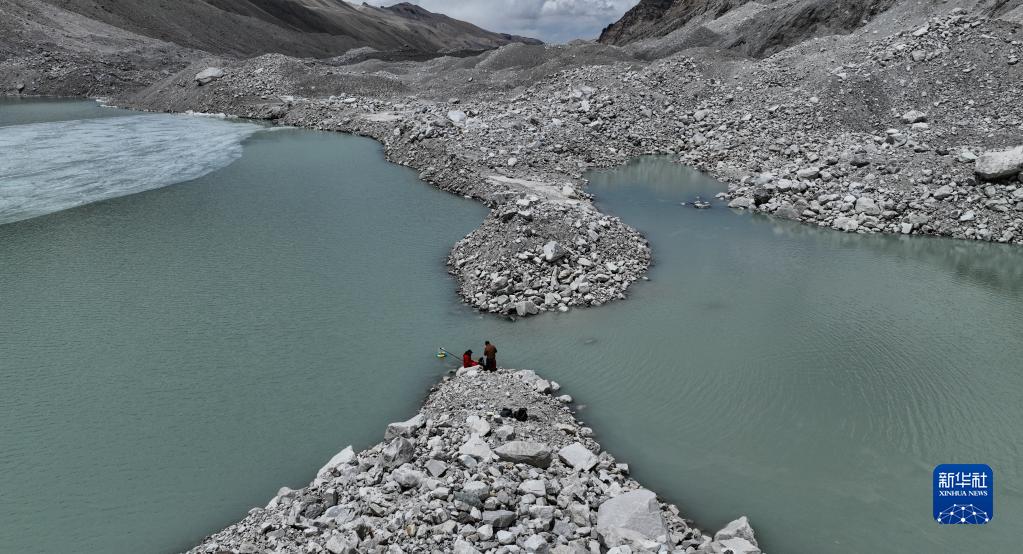 在珠峰海拔約5300米處的冰前湖,科考隊員在取水樣(5月12日攝,無人機照片)。
